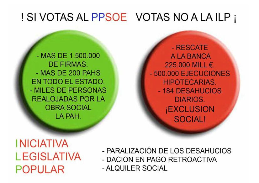 83’6% de los afectados son de primera vivienda, el 70’4% de impagos a la hipoteca son por desempleo, el 25’7% de afectados no tiene ingresos.Recordemos a la ciudadanía que votar al PP es votar sí a los desahucios, es votar sí a deudas que te condenan de por vida, es votar sí al rescatar a los bancos.