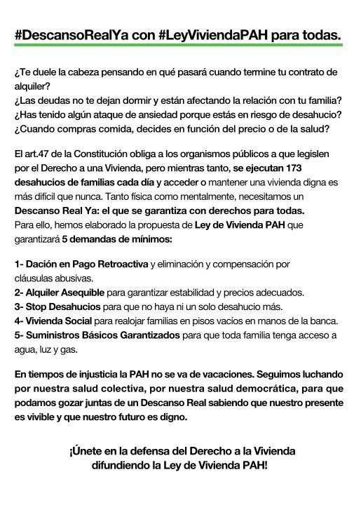 Descanso Real Ya es conseguir una ley que signifique una seguridad mínima de protección para todas las familias de este país. Por eso registraremos nuestra propuesta de ley en septiembre con la presencia de los grupos parlamentarios, interpelando a quien haga falta para conseguir su trámite y aprobación. Y no pararemos hasta conseguirla, aunque bancos y suministradoras traten de impedirlo desde la sombra. Porque hay vidas en juego. Porque hay soluciones sobre la mesa. Porque son derechos que necesitamos. Porque exigimos una ley de vivienda justa para todas.