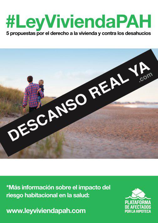 En defensa de esta propuesta de ley, hemos realizado el último mes una campaña de difusión bajo el lema de Descanso Real Ya. Para ello, hemos distribuido pegatinas en los municipios con este lema, sin que se supiera que la PAH estábamos detrás. Campaña que hoy se destapa con un vídeo de testimonios de personas que vieron afectada su salud por los procesos de desahucio y endeudamiento de por vida.